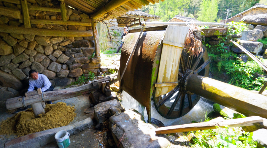 水碓是利用水力舂米脱壳的机械,在西汉末年就出现了,汉代桓谭(约前23—后50)的《桓子新论》里有关于水碓的记载。利用水碓,可以日夜加工粮食。凡在溪流江河的岸边都可以设置水碓,还可根据水势大小设置多个水碓,设置两个以上的叫做连机碓,最常用是设置四个碓,《天工开物》绘有一个水轮带动四个碓的画面。这种装置一直到现在还有一些偏远的地区也还在使用。