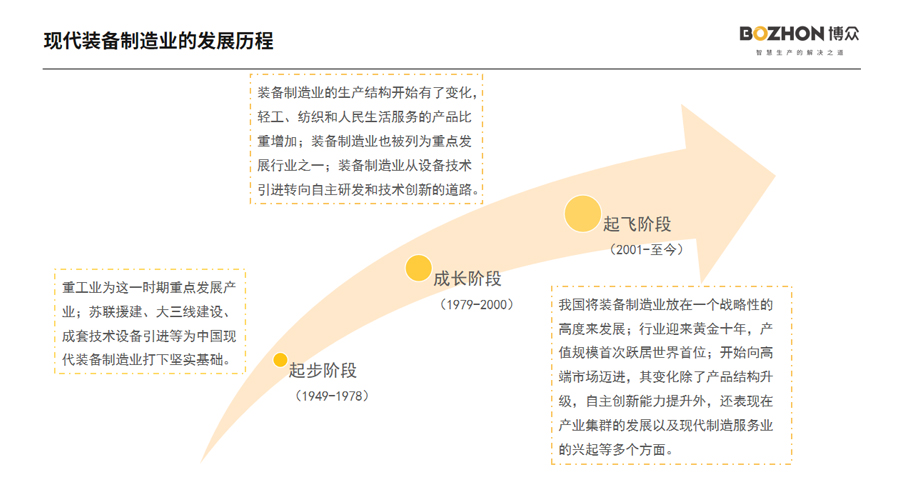 总之,中国装备制造业的发展经历了一个从仿制到自主创新、从低端到高端、从国内市场到国际市场的转型升级过程。如今,我国装备制造业已经取得了巨大的发展成就,但是也面临着一些挑战。未来,我国装备制造业需要加强技术创新和品牌建设,提高产品质量和品牌影响力,以适应市场需求的变化,同时还需要加强产业链整合,提高企业的整体竞争力。
