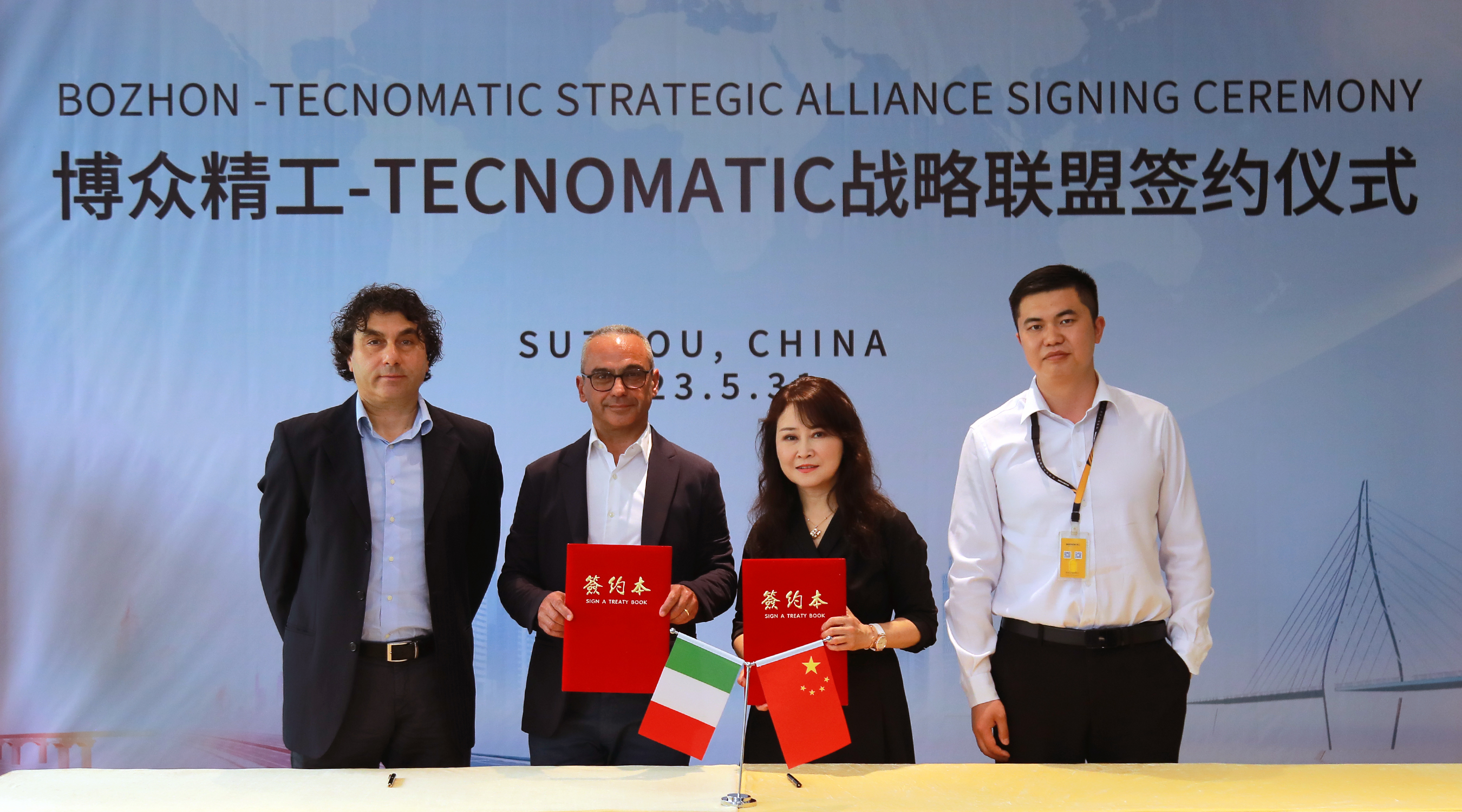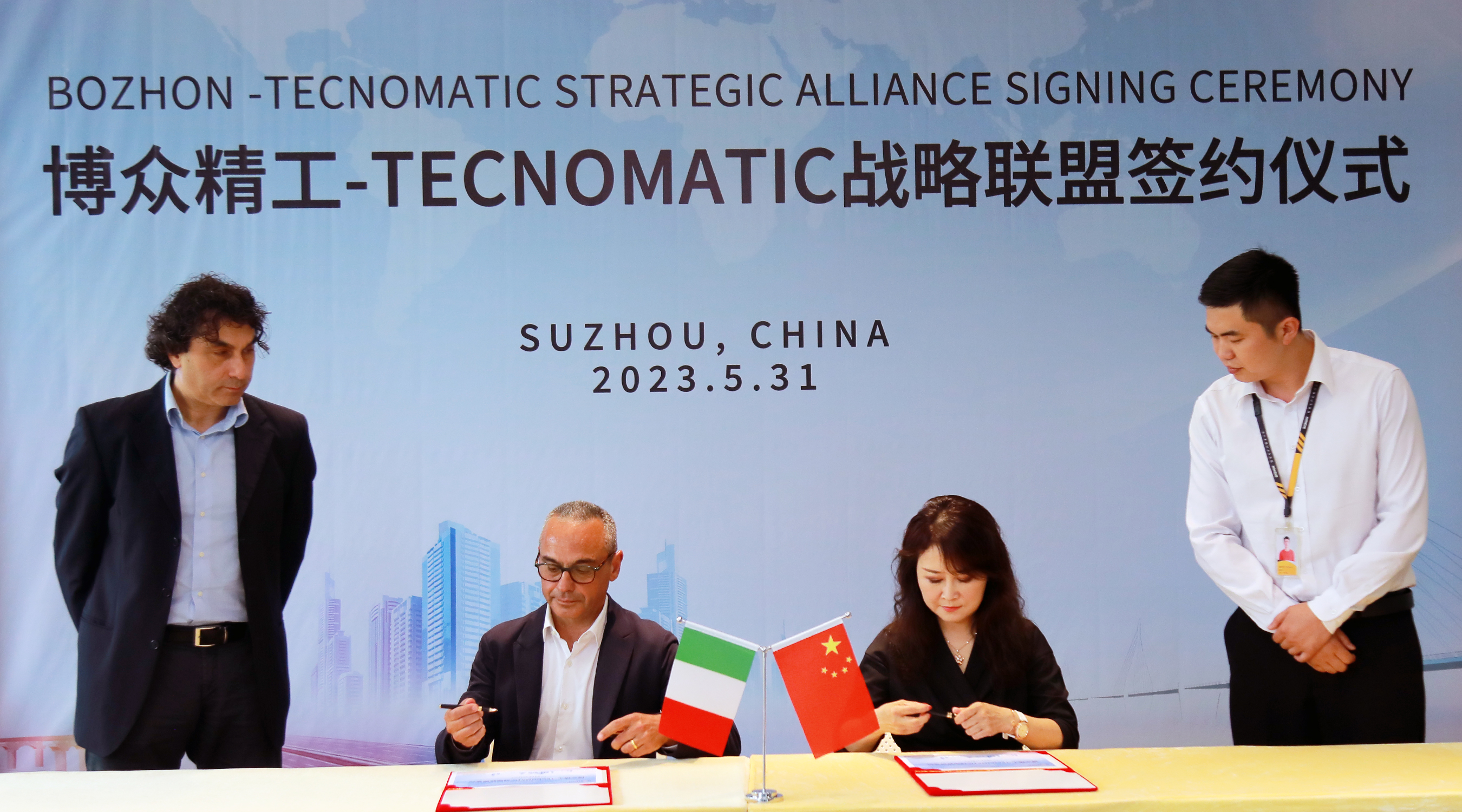5月31日,博众精工与意大利扁线电机制造设备企业TECNOMATIC(以下简称TM)达成战略合作,合作签约仪式在博众精工苏州总部举行。博众精工CEO王欣华,董事长特助殷学飞,汽车自动化产品线总经理饶文杰、工程总监蒋彦涛、销售总监王思全等;TM董事长兼首席执行官Giuseppe Ranalli(线上)、销售工程经理Daniele Adriani(线上)、销售总监Paolo Datore Giansante、技术总监Mauro Migliorati出席签约仪式。