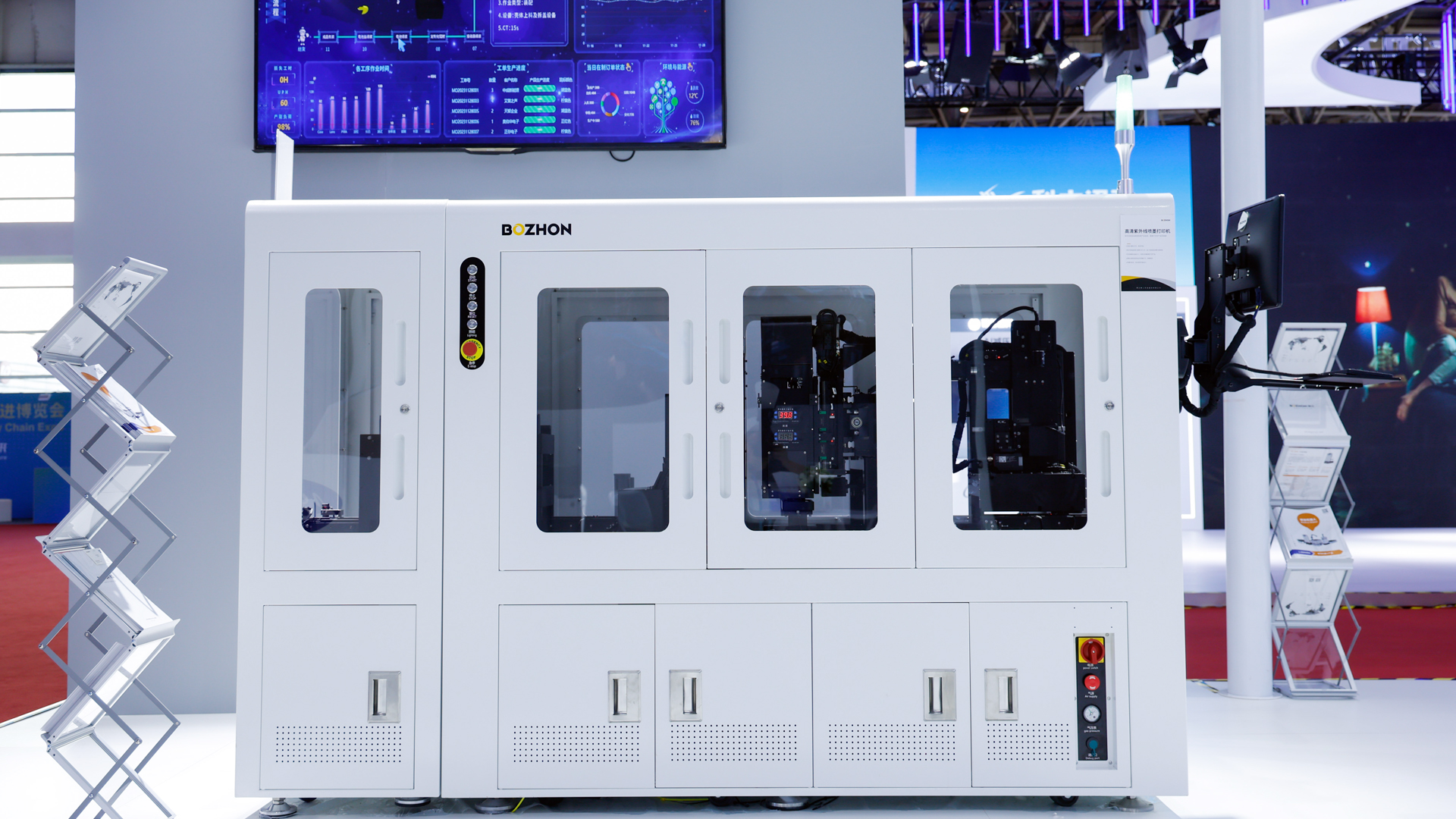 此设备所展示的核心零部件均由灵猴机器人(博众精工子公司)自主研发,拥有独立的知识产权。可用于检测Apple产品的螺丝、玻璃等零件是否瑕疵,加强品质管理,防止瑕疵品流入到制程的下一站。它可以90°侧面成像,用于细长物料测量和外观检测,借助四个正交视图,360°全方位对被测物料四个面作尺寸测量和外观检查。取代之前的四组相机检测的繁复方案,提高工作效率的同时,大大节约投入成本。此检测方案也可与上下游设备实现交互通信和协作功能互通,实时传输生产数据,监测生产全过程。在与Apple的合作过程中,我们从共同研发,到博众精工独立自主研发,逐步实现核心零部件国产替代,为我国制造业的发展不断提供助力。