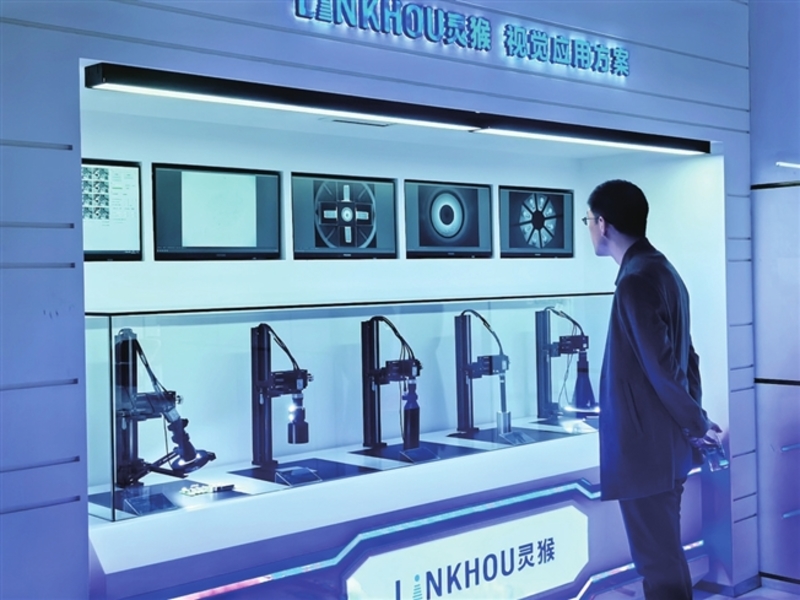 从上往下拍,一次性成像四个面,一款高精度的视觉系统设备从最初的柱体检测拓展到螺丝等工业产品检测场景。博众精工子公司总经理特助李二普介绍,按照传统的设备工作模式,设备需要四组相机加四组成像系统,才能拍出一个柱体的四个面,“市面上最少的也要三组设备,成本比较高。”李二普说,三年前,博众精工开发了一套新型的视觉系统,可以90度侧面成像,用于细长物料测量和外观检测,借助四个正交视图,全方位对被测物料四个面作尺寸测量和外观检查。“这个检测设备还能与上下游设备实现交互通信和协作功能互通,实时传输生产数据,监测生产全过程。”李二普说,最初,这款视觉系统用于检测口红瑕疵,现在已经应用于螺丝、玻璃等零件的检测,以加强品质管理。