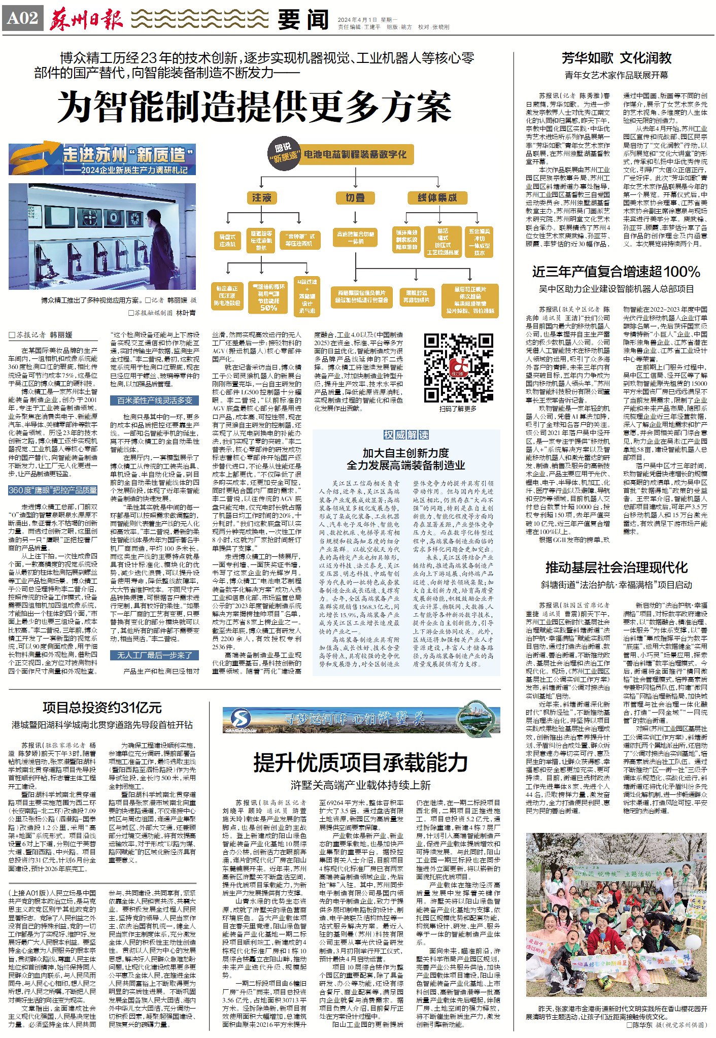 博众精工是一家苏州本土智能装备制造企业,创办于2001年,专注于工业装备制造领域。业务聚焦在消费类电子、新能源汽车、半导体、关键零部件等数字化装备领域。历经23年的技术创新之路,博众精工逐步实现机器视觉、工业机器人等核心零部件的国产替代,向智能装备制造不断发力,让工厂无人化更进一步,让产品制造更轻盈。