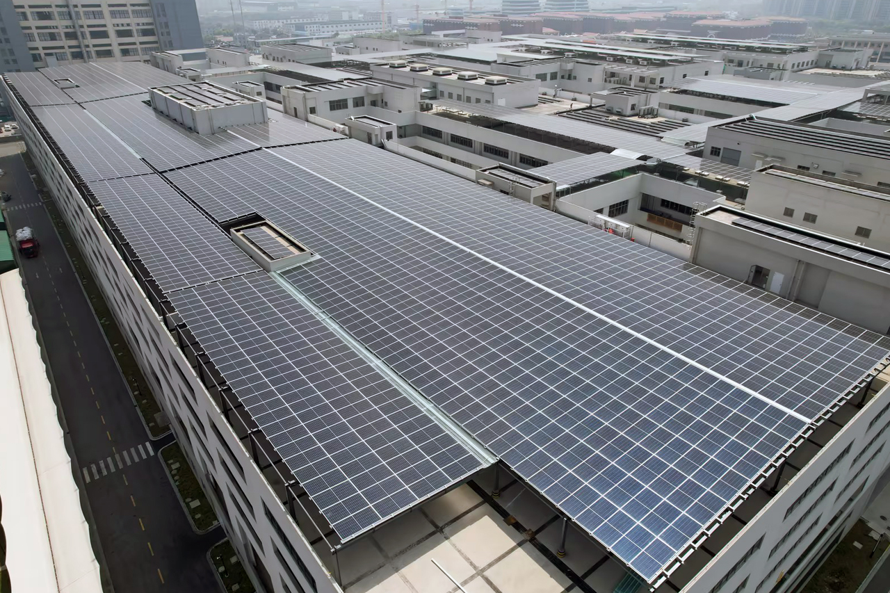 此次综合能源服务项目有效利用博众精工建筑屋顶约9万平方米,建设完成11MW分布式光伏电站。该项目使用550W的光伏组件17028片,电站功率达11MW,运行期每年合计发电量约1130万KWh,相当于4600余户中国普通家庭的全年用电总量,合计节约标煤4520吨,减排粉尘3074吨、二氧化碳11266吨、二氧化硫339吨、氮氧化物170吨。该项目投入使用后,将基本满足公司白天用电需求,同时,光伏板具备隔热功能,也可有效降低办公区及厂区温度。在低碳环保的同时,助力公司降低能耗成本。