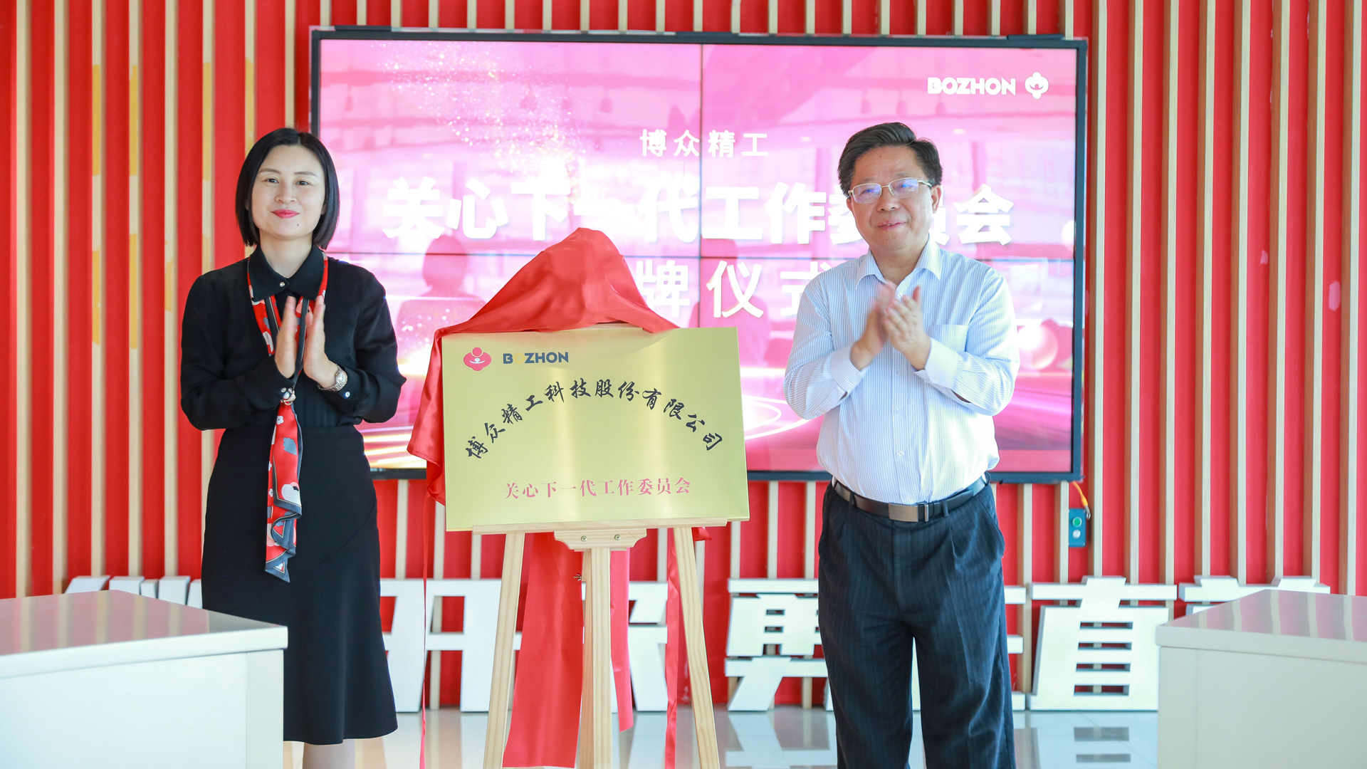 随着宣读声落下,揭牌环节正式开始。仪式现场由吴江区关工委主任肖仲伟,博众精工关工委主任、副总经理李芳共同揭牌。这一刻现场掌声响起,标志着博众精工关心下一代工作委员会正式成立。