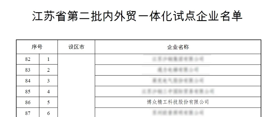 近日,江苏省商务厅正式公布了“第二批内外贸一体化试点企业名单”,博众精工凭借在智能装备制造领域的深厚积累、创新能力和国际市场竞争力成功入选。本次入选,不仅是对公司长期以来坚持智能装备制造领域的肯定,更是对公司在推动内外贸融合发展、促进国内外市场循环畅通方面的认可。
