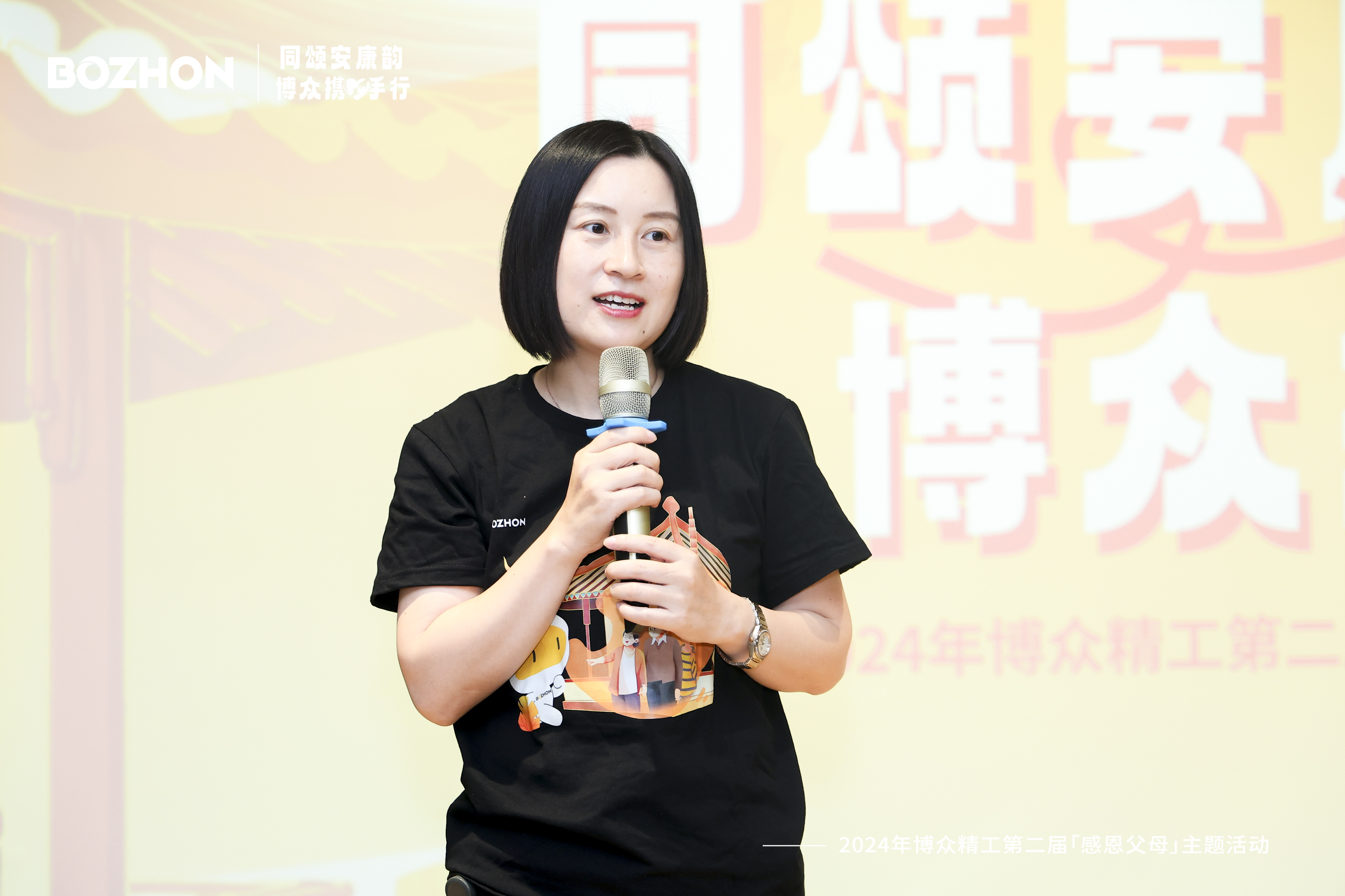 感恩仪式最后,由博众精工副总经理李芳与大家分享交流。李总在现场与大家分享了她从刚开始来博众精工,到现在在公司已有二十余年的时间里,自己在与父母相处过程中三个深有触动的瞬间。每个阶段,父母都对她的事业给予了默默的帮助。随后她向现场的叔叔阿姨们表达了诚挚的感谢与敬意,相信在每个人的职业发展中,他的父母在背后都给予了无声且不求回报的支持。在分享的最后,李总也请员工父母们放心,公司将继续努力为员工创造一个和谐、稳定的工作环境,让每一位员工都能在这里安心工作,实现自己的职业梦想。