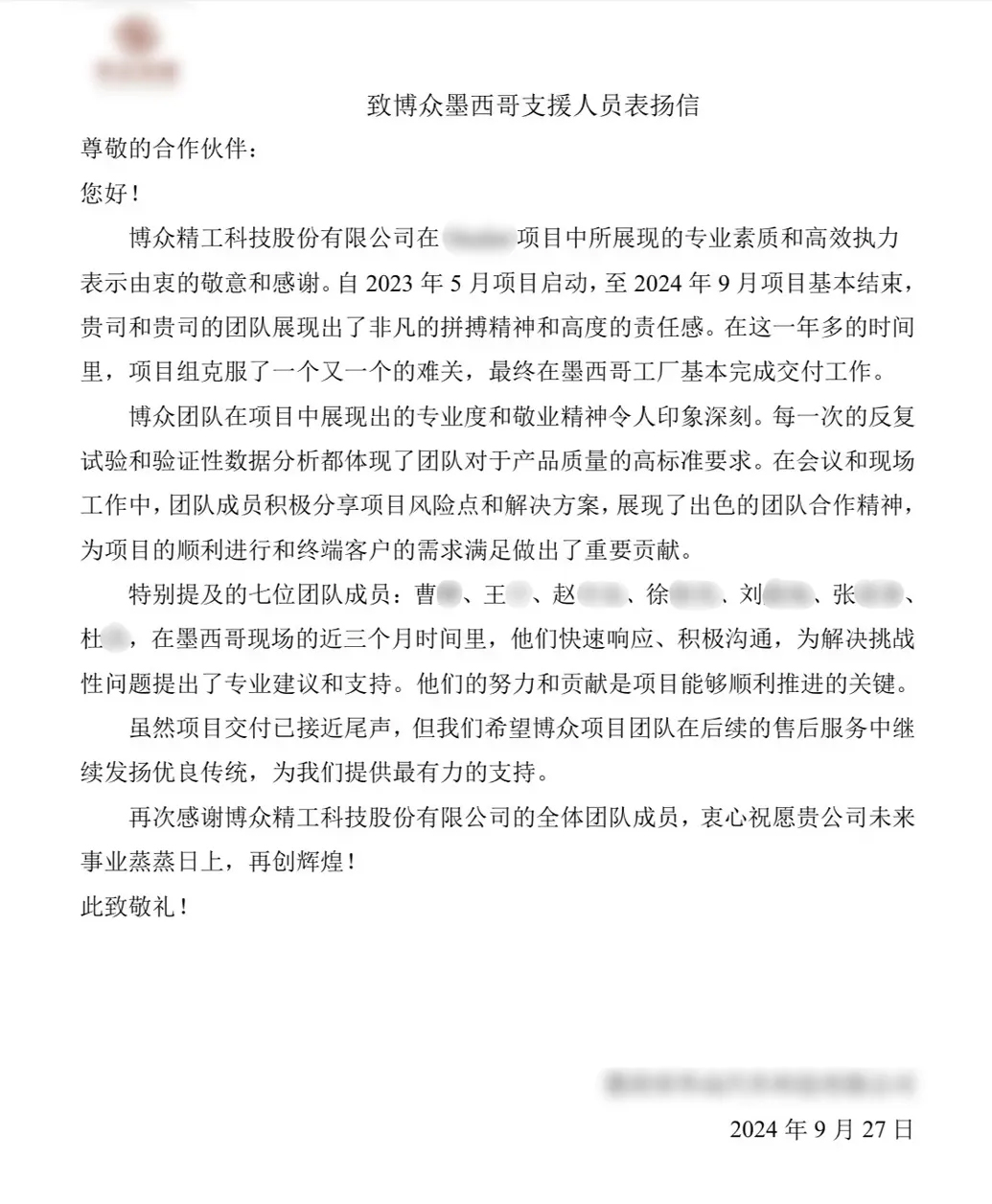 近日,博众精工收到一封来自某客户的感谢信。客户在信中对我司及项目团队成员的专业度、拼搏精神及责任感,给予了高度的赞赏与诚挚的感谢。