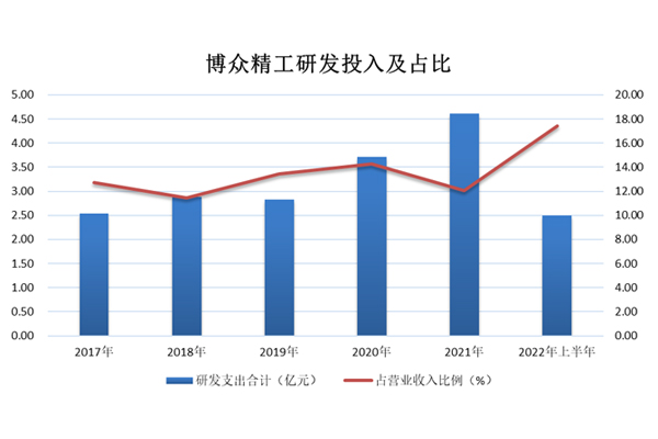 作为技术驱动型企业,博众精工多年来不惜重金投入研发。2021年,公司研发投入4.62亿元,研发投入占营业收入比例为12.07%。今年上半年,公司研发投入2.50亿元,研发投入占营业收入比例为17.45%。日前,由江苏省工商联与省科学技术发展战略研究院联合发布了“2022江苏民营企业创新100强”,博众精工(688097)位列苏州第四、全省第十。据了解,创新100强企业,2021年度研发投入占比达3.7%,而博众精工显著高于这一水准。