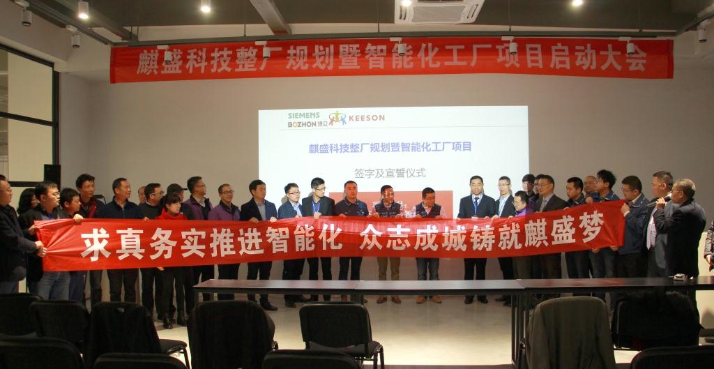 各方发言结束后,三方进行签字和宣誓仪式。由此,麒盛科技智能化工厂项目正式启动。